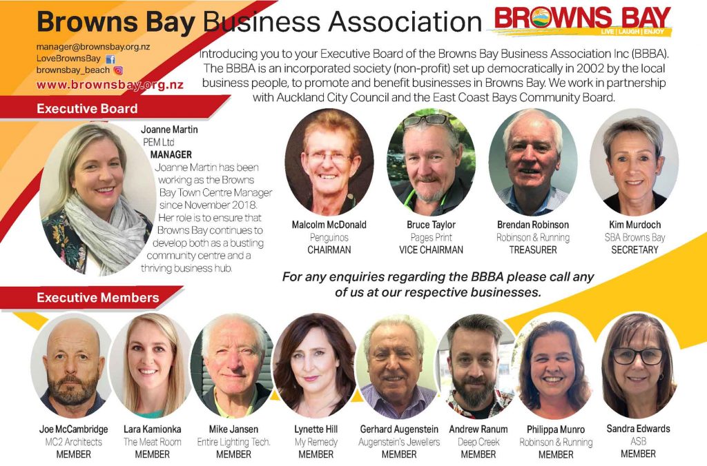 Executive Committee meetings are held approximately every six weeks, and all members are welcome to attend. Please contact Joanne Martin, Browns Bay Town Centre Manager (contact details below) for meeting information. Membership of the Business Association is open to owners or tenants of commercial properties within the Business Association’s defined area.